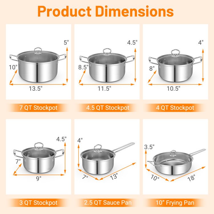 -Includes 4 stockpots (7/4.5/4/3 QT), a 10" frying pan, and a 2.5 QT saucepan
