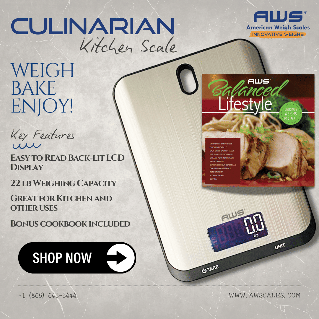The Culinarian is a 22 lb capacity stainless-steel kitchen scale that comes with the 64-page Balanced Lifestyle cookbook. Use the TARE to give the ability to use a container or a plate on the surface. When not in use hang this scale-up using the hook opening on the top of the scale or store it in a drawer easily with its thin design. Great for weighing liquids with water milliliter and milk milliliter unit setting. Water-resistant for small liquid spills. Bring all your favorite recipes to life and add new ones with this modern, easy-to-use, and affordable kitchen tool.