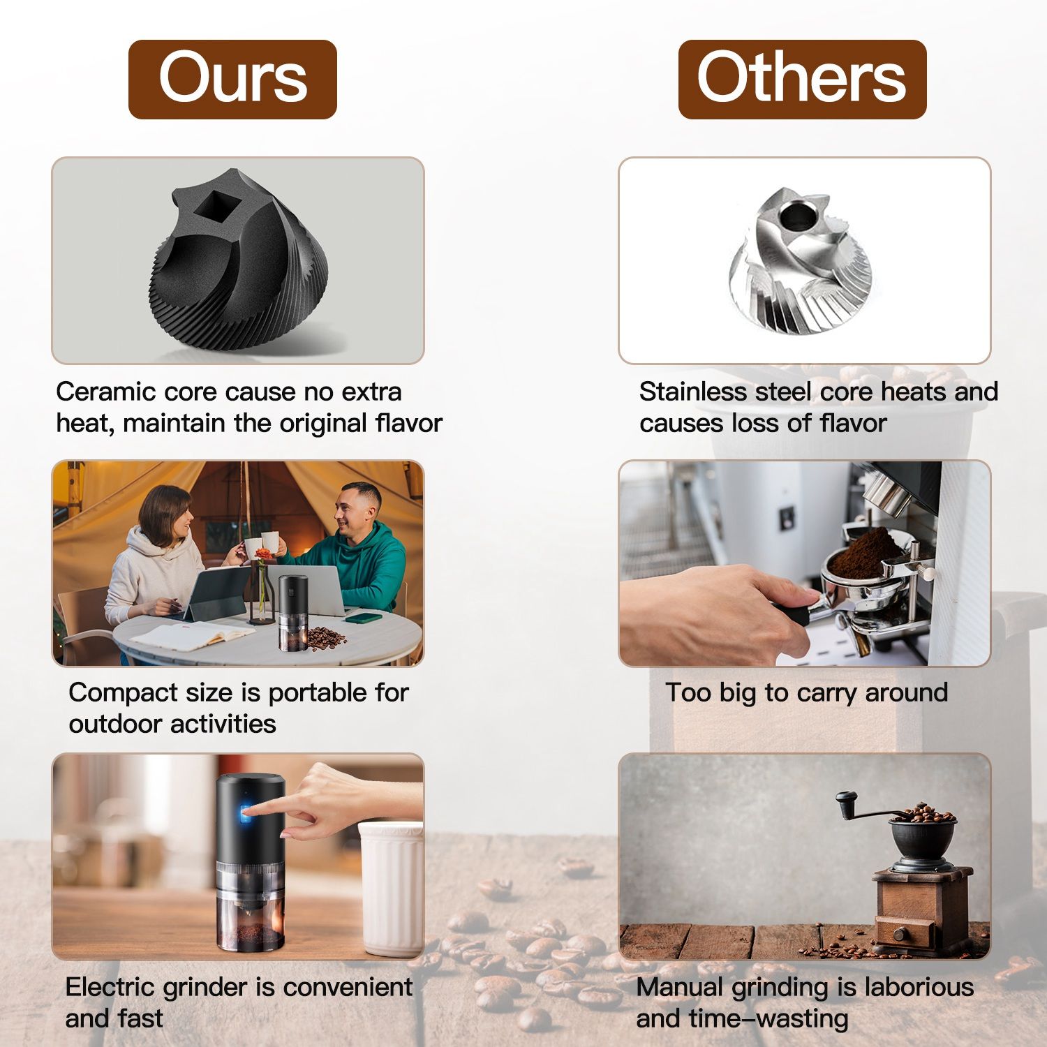 *Cordless & Portable Coffee Grinder*:Compared to laborious manual grinding,our electric coffee grinder with powerful motor and ceramic core,making the coffee bean grinding more quickly and evenly while maintaining the original flavor and aroma without generating extra heat. Measuring 2.75x2.75x7.08in,our compact and lightweight cordless coffee grinder helps you enjoy quality coffee on the go.