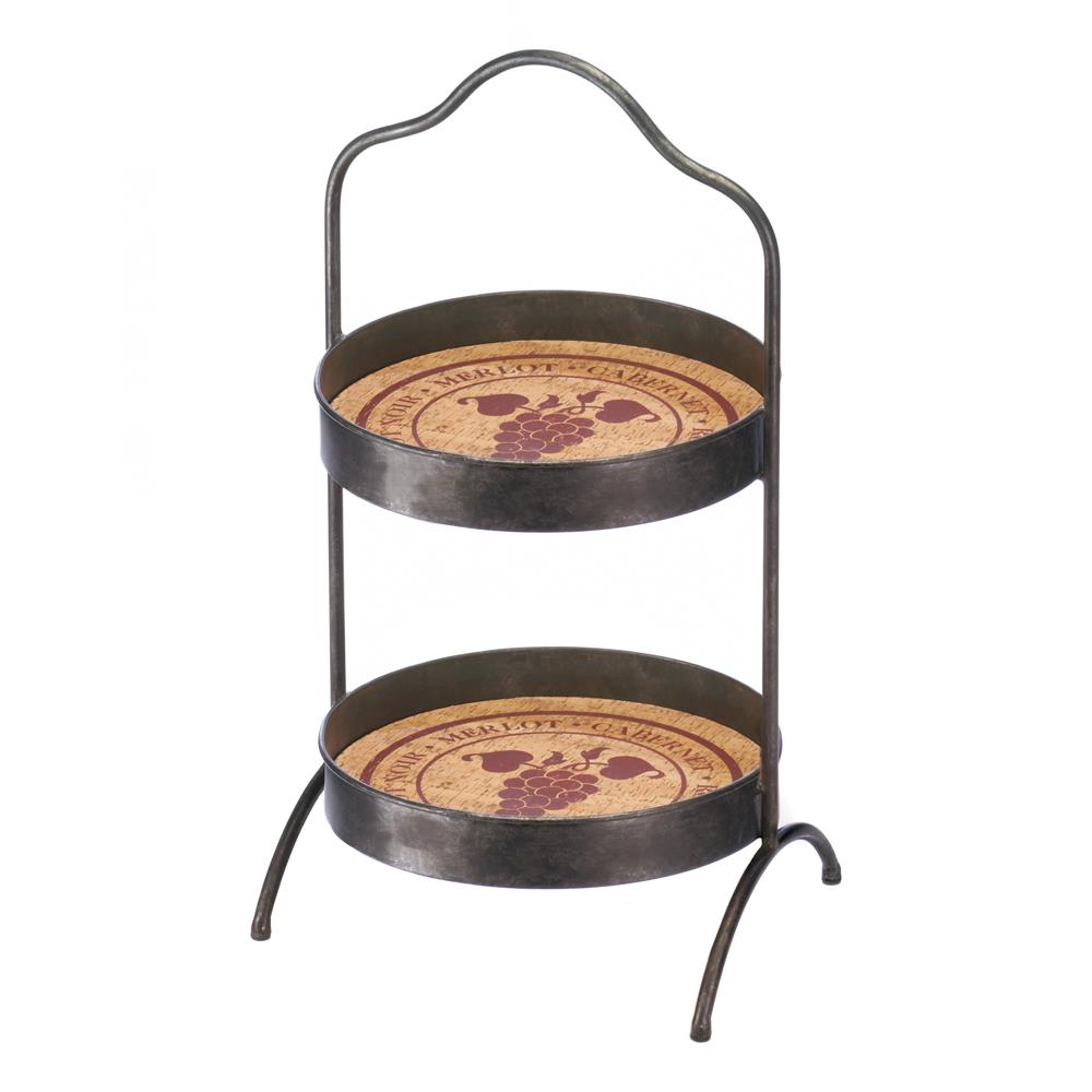• This standing two-tier tray has all the style you need to make your room stand out. The wooden insets feature a classic wine grape design with the names of popular wines surrounding it. The metal stand features a farmhouse, antiqued finish that will always look great.