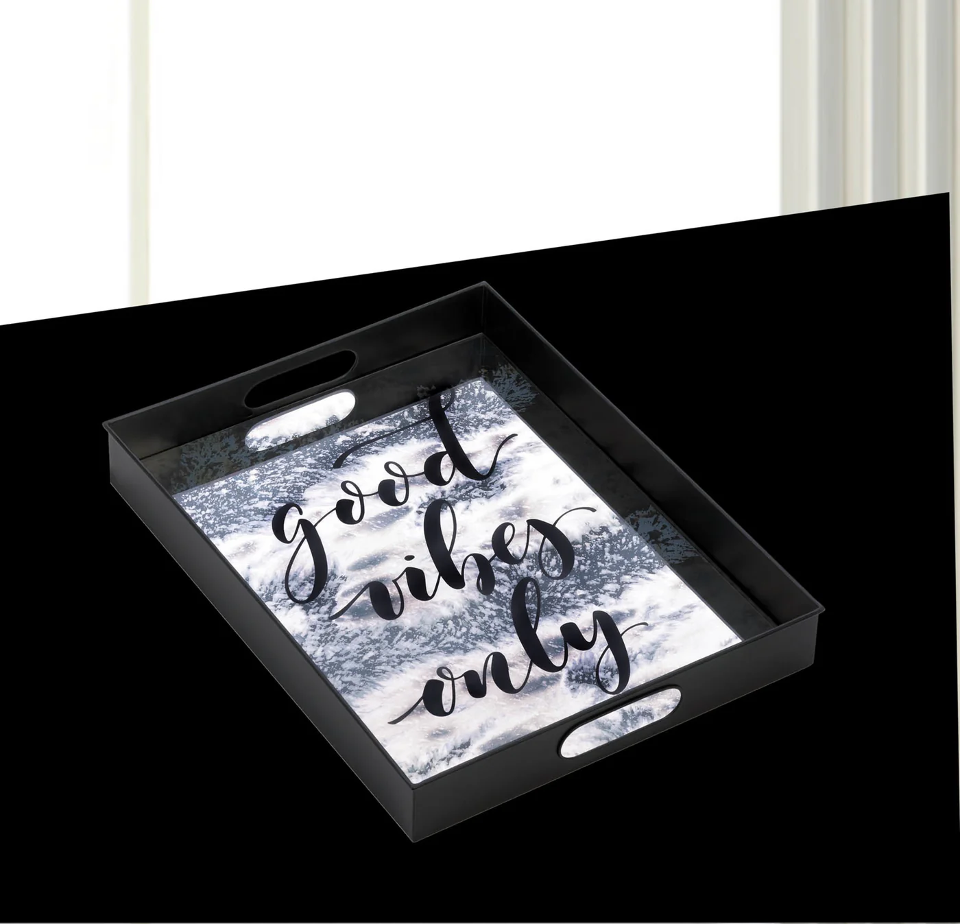 A fun way to display items on your vanity or ottoman, the South Beach “Good Vibes Only” Mirror Tray features a glossy black display that will glam up your décor. >>Rectangular tray with side handles. Black cursive writing.