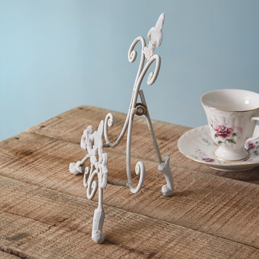 This intricate stand is the ideal home to display heirloom plates, artwork, a framed photo, or other memorabilia. Detailed with elegant curves and fleur de lis accents, this item is just as beautiful as the items you will display on it. Stand is fashioned of cast iron and is 4½''D when open.